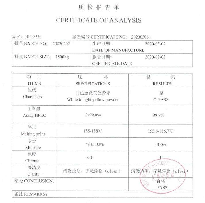 防护措施:在操作BIT时,应佩戴防护衣、护目镜和橡胶手套,避免与皮肤或眼睛接触。 应急处理: 如与皮肤接触,立即用大量清水与肥皂清洗。 如不慎溅入眼中,立即用大量清水及缓冲液冲洗,并尽快就医。 请注意,在使用过程中仍需严格遵守安全操作规程,确保人员和环境的安全。