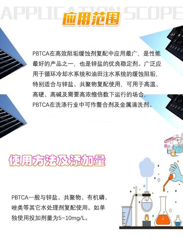 PBTCA一般与锌盐、共聚物、有机磷、唑类等其它水处理剂复配使用。如单独使用投加剂量为5~15mg/L。