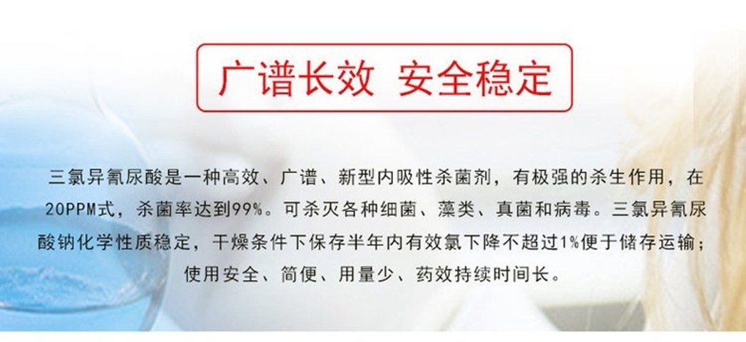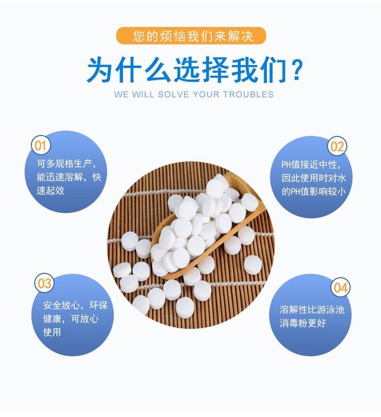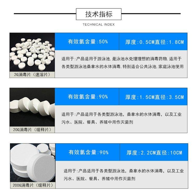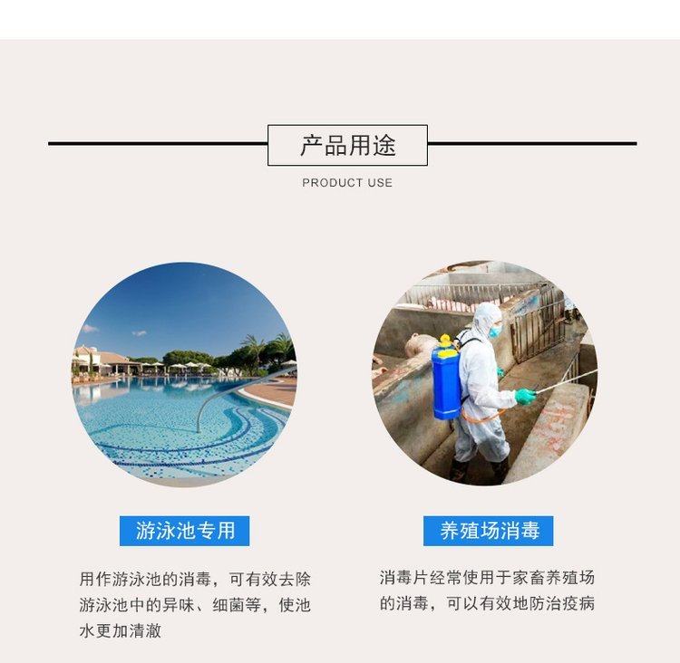 工业级氯片主要应用于水处理消毒、纺织漂白、养殖杀菌及工业氯化反应等领域,具体包括饮用水、游泳池、工业循环水的杀菌消毒,纺织品漂白,水产养殖环境杀菌,以及橡胶、造纸等工业的氯化工艺。