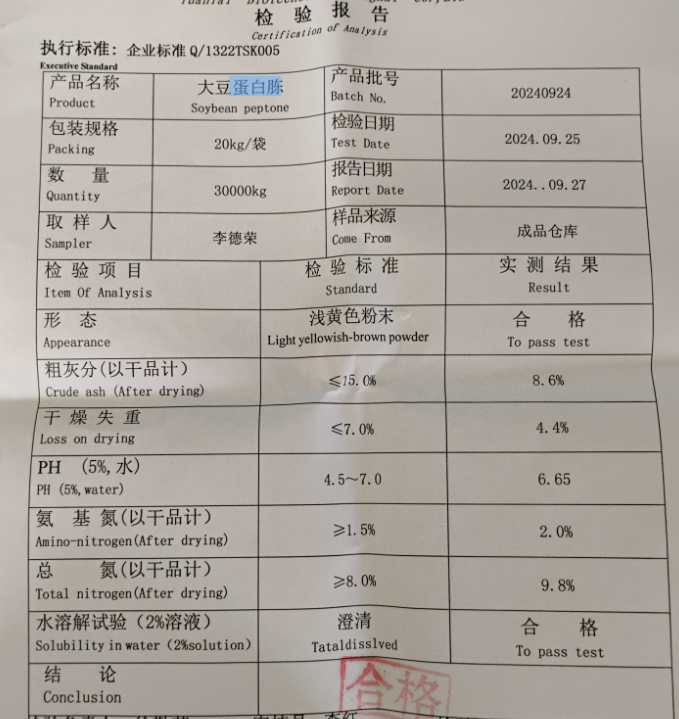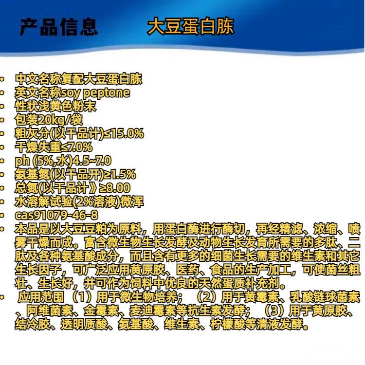 用途——采用大豆为原料,经发酵喷雾干燥而成。用于黄原胶、食品添加剂、生物制品等发酵产品中。酵母蛋白胨。以高蛋白的面包酵母为原料,经自溶、酶解、分离、浓缩和干燥等工艺,制得的安全、稳定、营养全面的蛋白胨产品。是发酵时使用的培养基成分