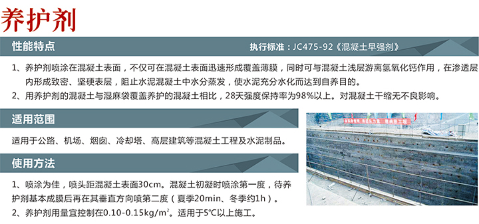 - 喷涂时机:混凝土终凝后(表面无积水)进行,避免过早或过迟影响效果 。