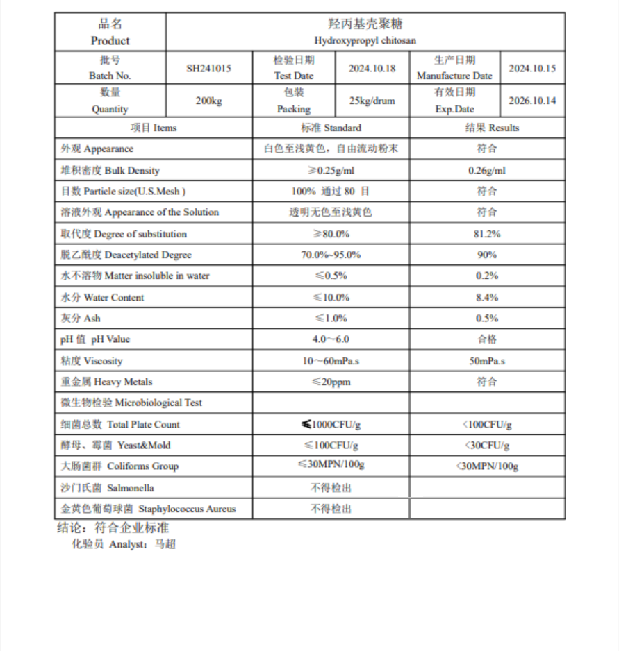 工业级羟丙基壳聚糖是一种通过羟丙基化改性获得的壳聚糖衍生物,其水溶性显著优于壳聚糖,可在中性至弱碱性环境中溶解,同时保留了良好的生物相容性、 性、成膜性和乳化性,因此在多个工业领域有广泛应用。