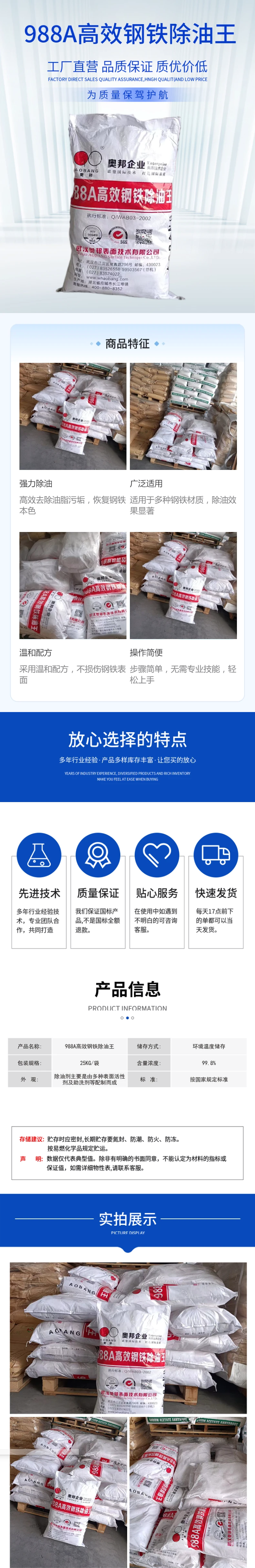 在钢铁加工与处理中, 高效钢铁除油王广泛应用于钢铁制品在电镀、发黑、磷化及防锈处理前的除油清洗,能有效去除表面油污,确保后续处理工艺的附着力和质量;它对重油、拉伸油、冲压油等顽固油污有优异的乳化分解能力,适用于中高温碱性清洗剂或电解除油粉的生产。