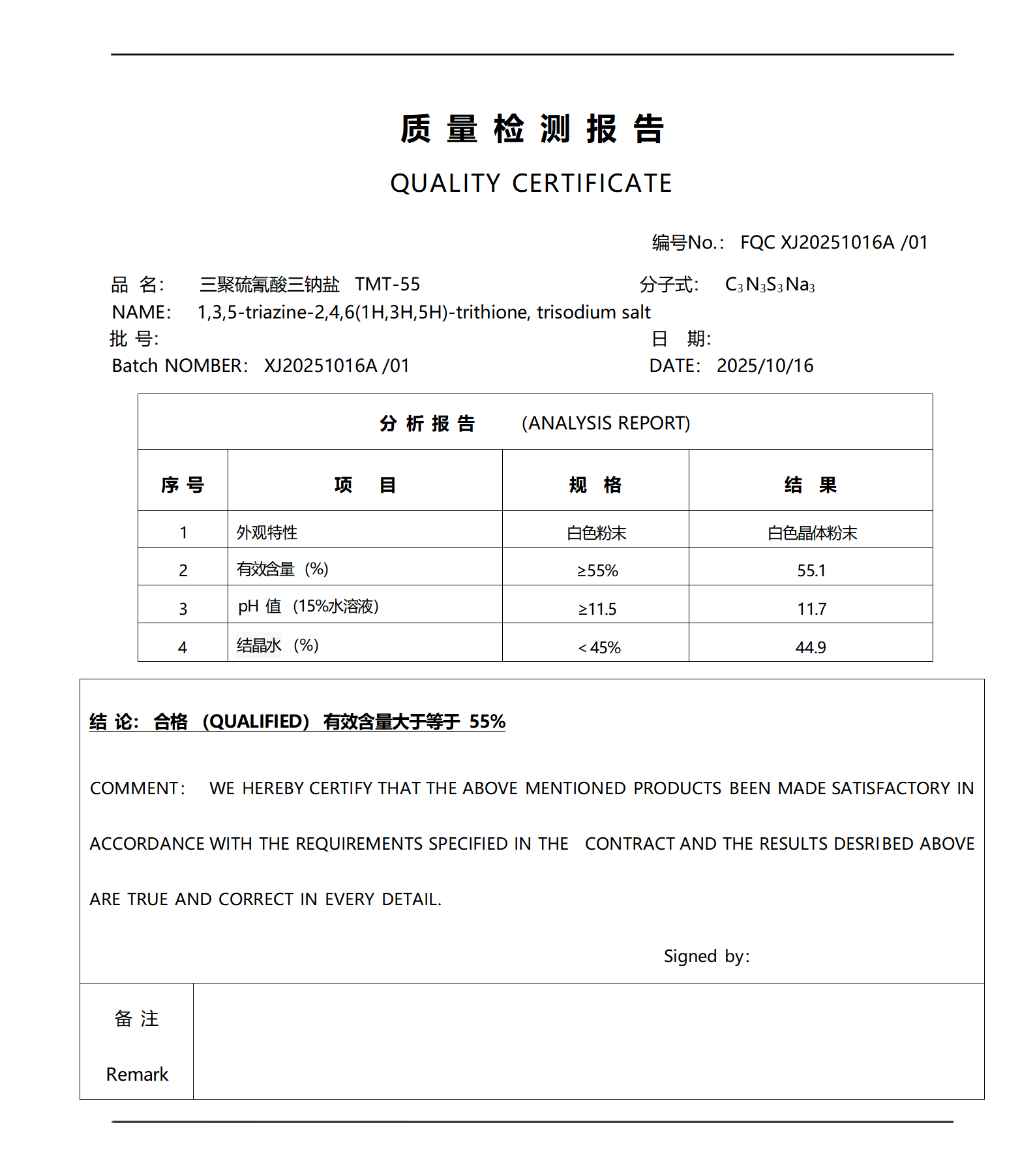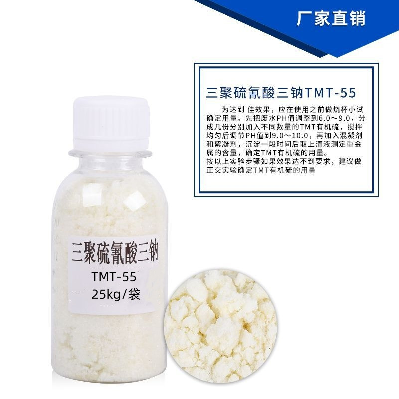 运用:检测金属离子和有机物中的硫氰酸根离子:在化学实验中,常用作试剂,用于检测金属离子和有机物中的硫氰酸根离子。它在水中溶解度较高,并能与许多溶剂反应生成相应的络合物。 重金属废水处理:是一种重金属排除剂,可以用于处理含有重金属的废水,例如电镀、线路板、矿山冶炼电厂和机械加工等工业废水。 其他用途:此外,还可以用于制备其他有机化合物、染料等领域。