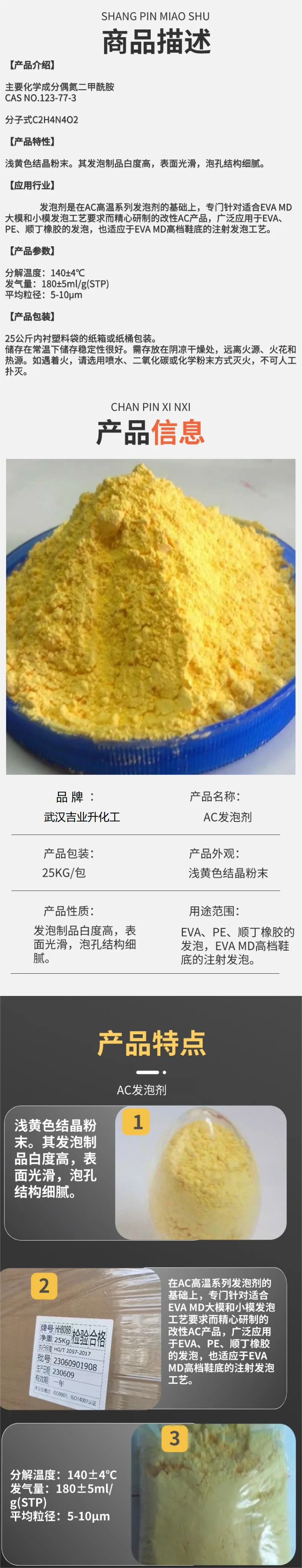 偶氮二甲酰胺 发气量220 塑料发泡剂 轮胎橡胶发泡 隔音材料 cas123-77-3