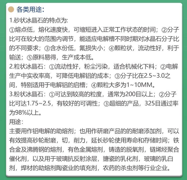 铝电解:是铝电解过程中的助溶剂。在铝电解工业中,作为电解质的主要成分。