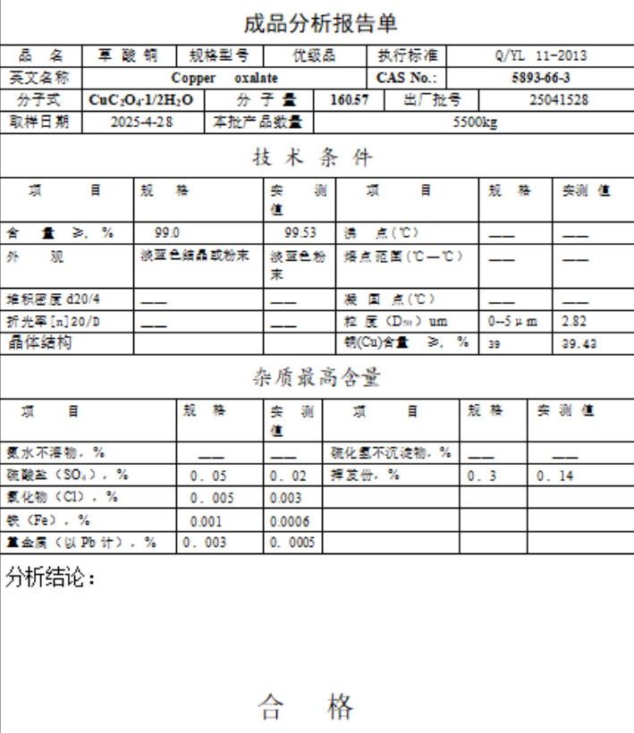 草酸铜(CupricOxalate)是一种浅蓝绿色粉末状的化学物质,在多个领域都有着应用。以下是关于草酸铜的详细解释: