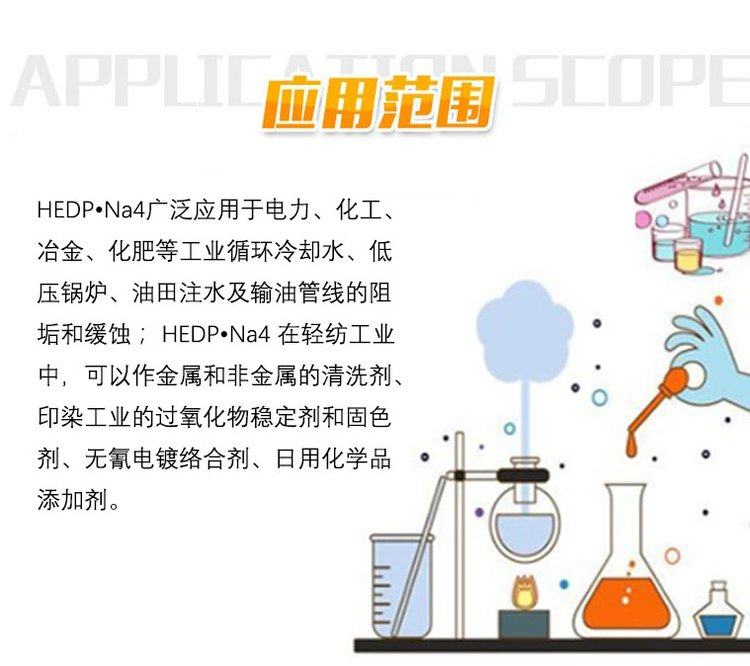 工业级羟基乙叉二膦酸四钠(HEDP·Na4)是一种高效的阻垢缓蚀剂,主要应用于水处理、工业设备保护及轻纺等领域。以下是其具体用途: