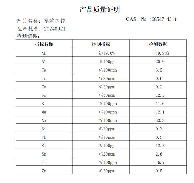 草酸铌铵(CAS号:168547-43-1)是一种白色粉末状化合物,主要应用于以下领域: