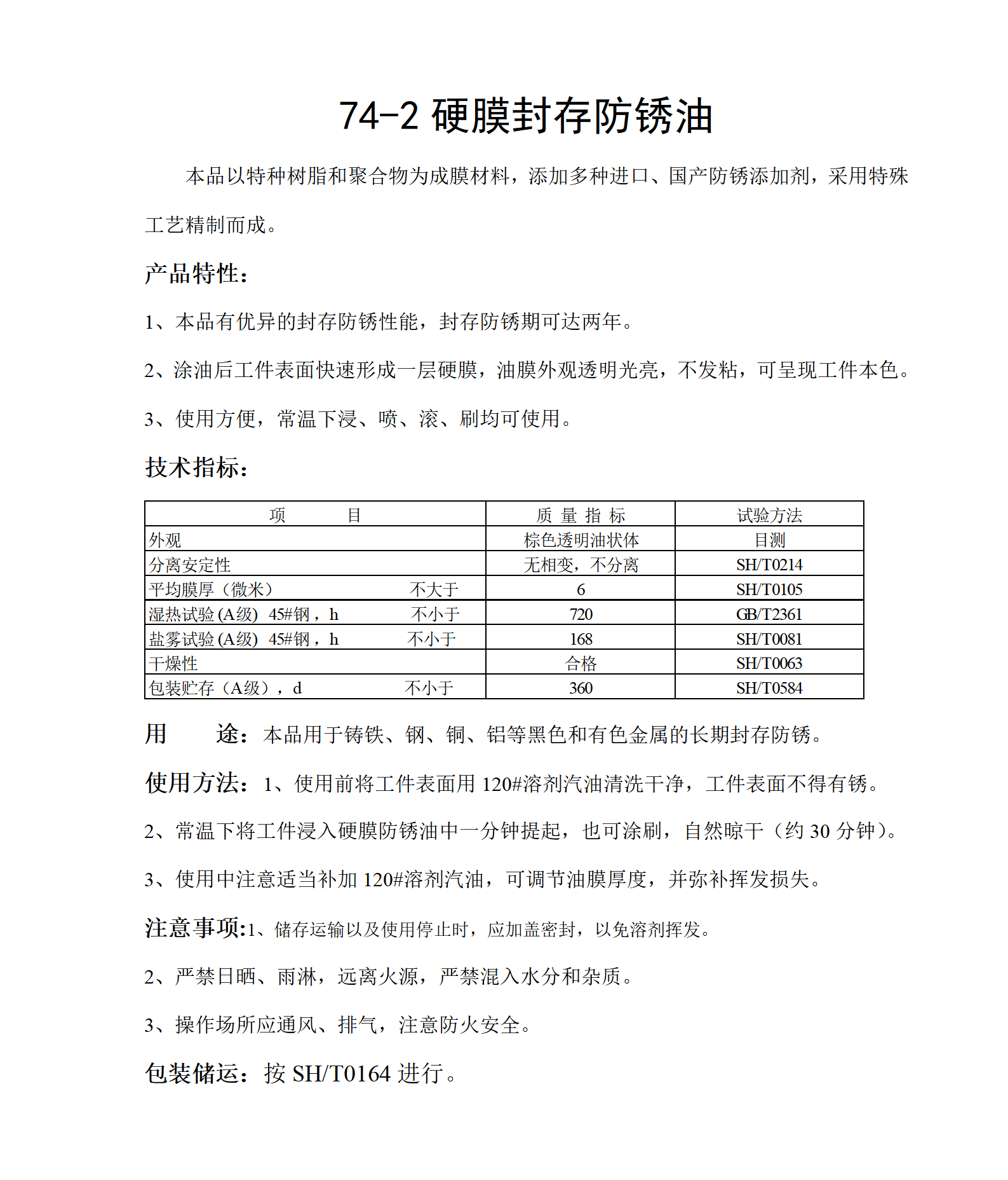 74-2硬膜防锈油主要用于金属表面防锈处理,适用于黑色金属(如钢铁、铸铁)及有色金属(如铜、铝)的防护 ,尤其适合长期储存或运输中的金属部件防锈。