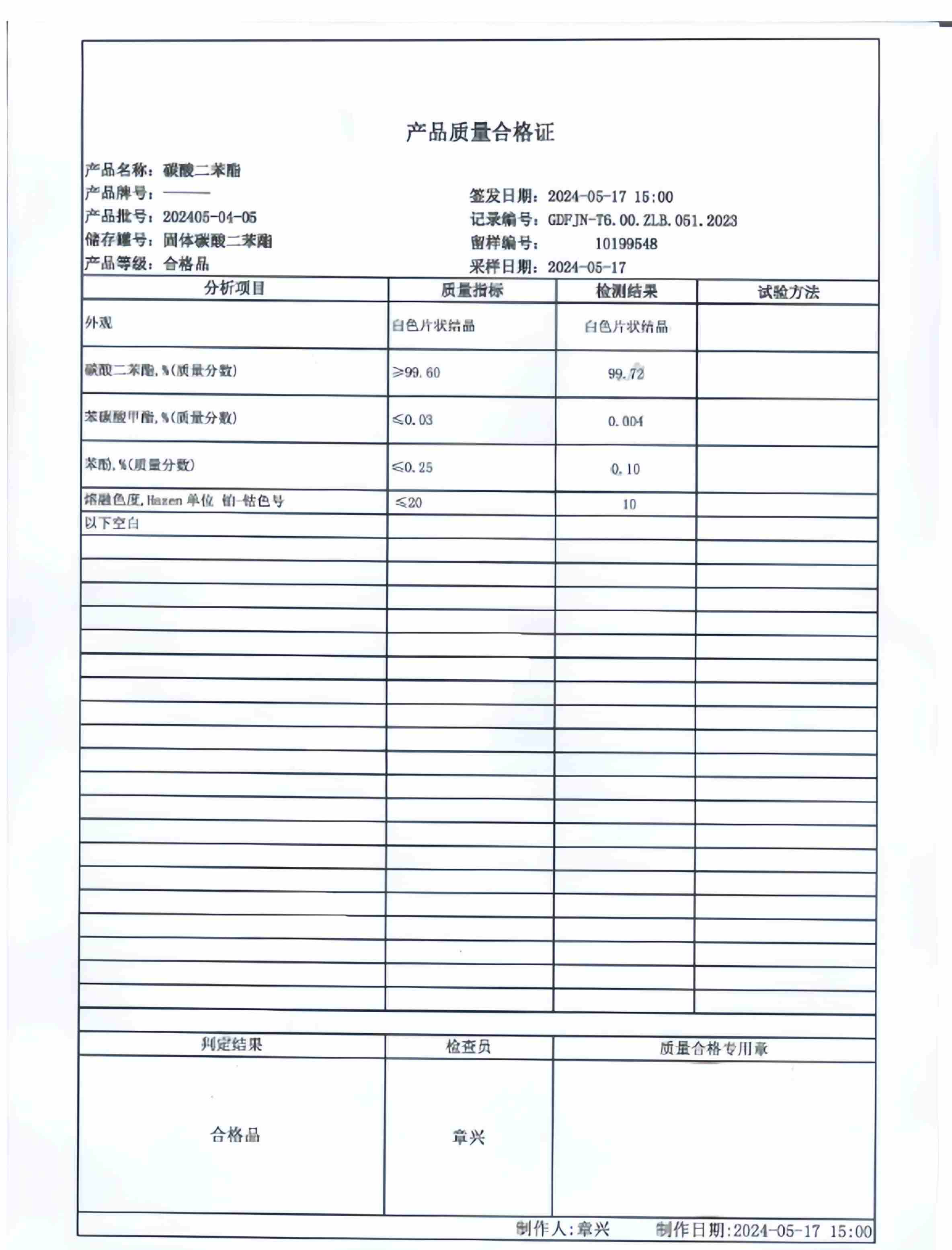 - 产品名称碳酸二苯酯 含量99.6% 白色片状 光学电子材料 高分子材料 cas102-09-0
