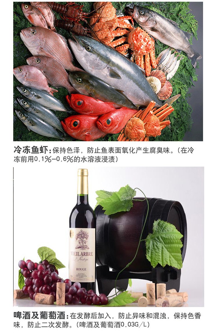在食品行业中,应用于肉制品、水果、蔬菜、罐头、果酱、啤酒、汽水、果茶、果汁、葡萄酒等产品的生产和保存过程中。