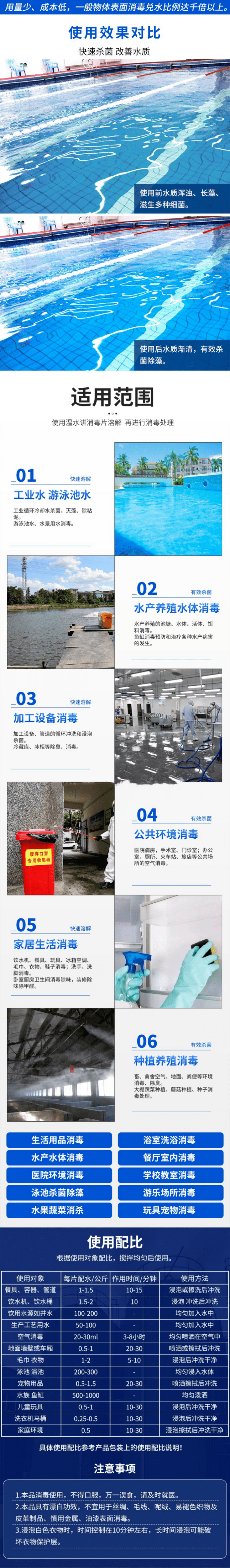 - 游泳池水消毒(每日投加3–5 g/m³,维持余氯、除藻、净水)